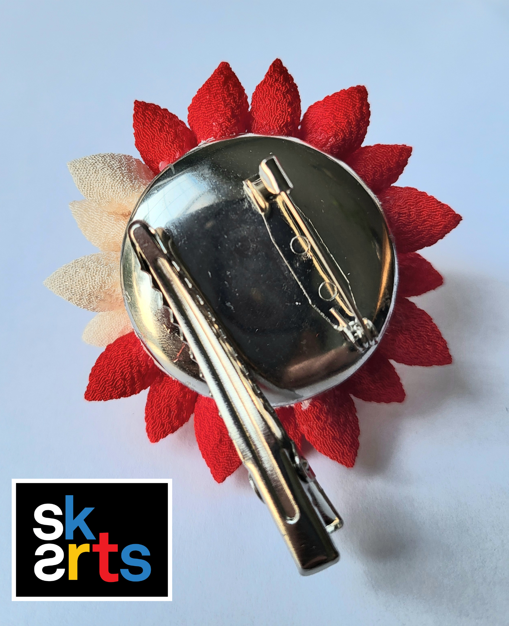This week’s project is another of the pieces created as part of my tsumami-zaiku certification course, and is a clip brooch – meaning it has both a clip and brooch back so that it can be work in two different ways. This piece features a single large two-color red-orange and creamy white chrysanthemum in chirimen fabric.